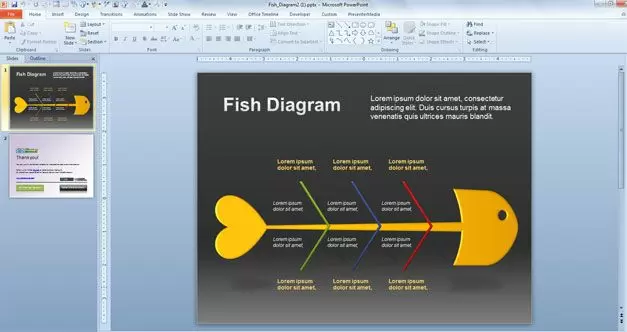 This free fish diagram has a fish style but similar to the diagram. Causes in Fishbone diagrams are usually grouped into major categories to identify these sources of variation. The categories typically include: people, methods, machines, materials, measurements and environment. You can free download Fish Diagram for Microsoft PowerPoint.