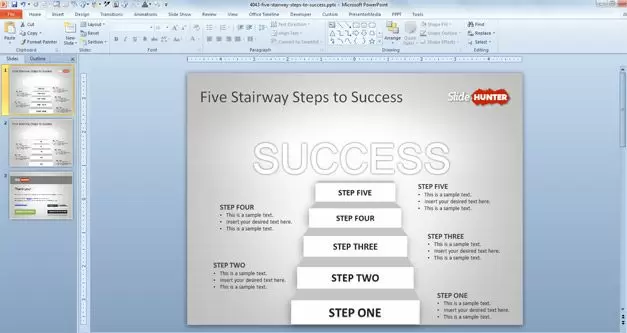 The presentation template comes with two slide layouts containing different arrangements of text and titles for the stair steps. You can download free stairway PowerPoint template for presentations created with Microsoft PowerPoint 2010 and 2013.