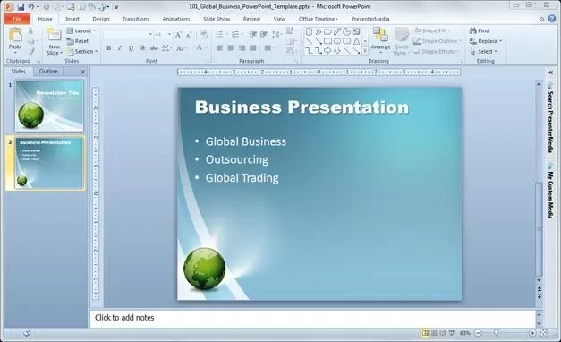 As you can see in the figure above, the business presentation template contains two slides. The master slide has a nice globe image in the bottom left corner, while the internal slide has enough space for your bullet list and images. You can download this template for simple but robust business presentations for topics like outsourcing, global trading, virtual assistants, executive summary, etc.