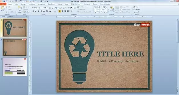 The presentation title is decorated with the recycled logo inside a light bulb illustration in PowerPoint.