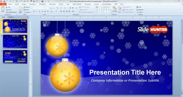 The free Christmas balls template for PowerPoint comes with a nice cover slide design and internal slide with yellow balls and snowflake illustrations in the blue background.
