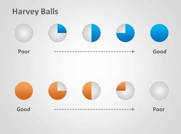 You can use this free template with Harvey Balls for different applications including software per call center presentations as well as many other astronomical PowerPoint presentations. Harvey Balls are strongly used in project management combining with other diagrams and Gantt presentations so you can easily download Harvey Balls for your project management tracking software or presentation slides.