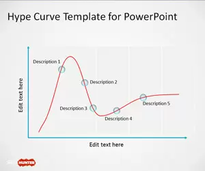 This free Hype Curve design for PowerPoint can be edited in PowerPoint using shapes. You can add your own text or change the shape properties to match any desired style. The Hype template for PowerPoint contains three different slide designs with the hype cycle.