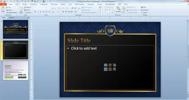 Inside this free royal PowerPoint template you can find a cover slide design with space for a title and an internal slide design with a blue and black background color for the slide content. You can download free king PPT template for Microsoft PowerPoint 2007 and 2010 presentations but it is also compatible with Microsoft PowerPoint 2013 and available in widescreen slide format.