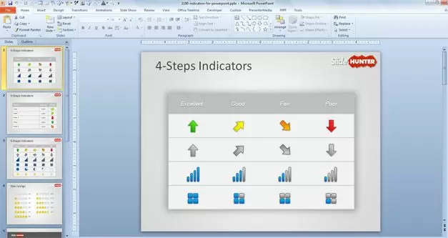 Inside this free PowerPoint template you can find useful shapes and graphics to make presentations with awesome dashboards and KPI. You can download the free KPI Template for PowerPoint and use the 4-step indicators or 5 step indicators to show trends or as directional indicators. For example, the directional arrows in different colors let you easily represent an indicator state as excellent, good, fair or poor or show a positive or negative trend.