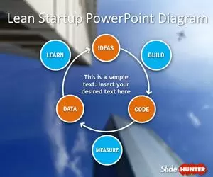 Inside this free Lean Startup template for PowerPoint you can find a simple cycle diagram describing the Lean Startup process over a blurred corporate building or business image.