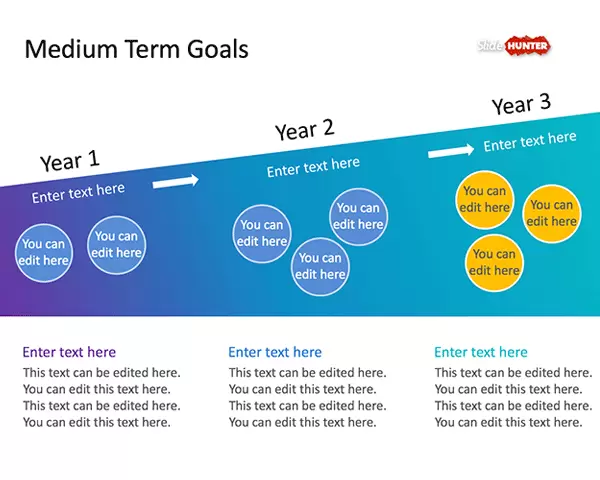 Medium Term Goals PowerPoint Template is a simple presentation template that can be used to present a mid-term goal or plan to an audience. It contains a slide with a modern gradient background and space to place the goals and objectives. This free template can be used as a planning template for organizations and individuals needing to present the business goals.
