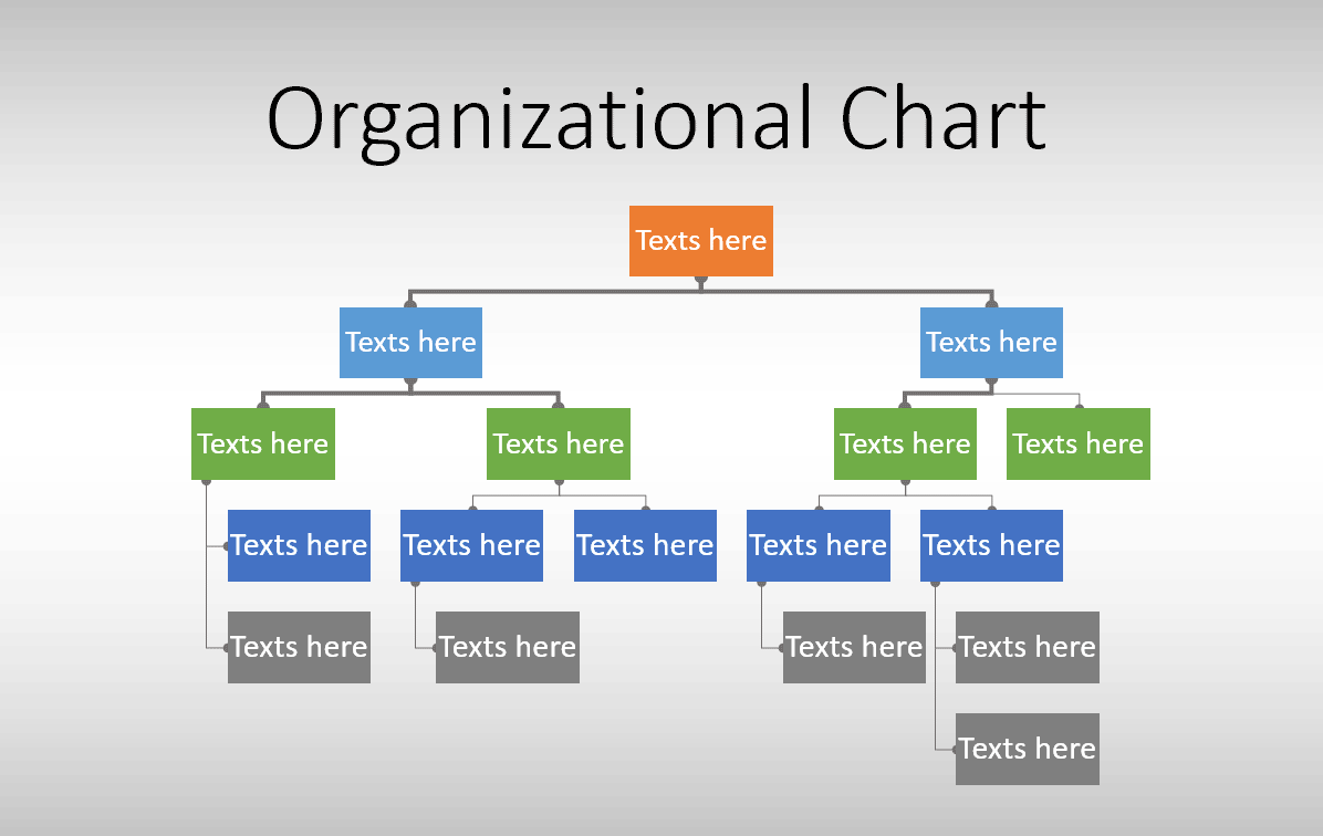 The example above shows a simple org chart structure created in PowerPoint using shapes. You can easily edit this org chart by dragging and dropping the shapes in the slide. Free Organizational Chart template for PowerPoint is a PPT template that you can download to prepare awesome org charts for your organization.