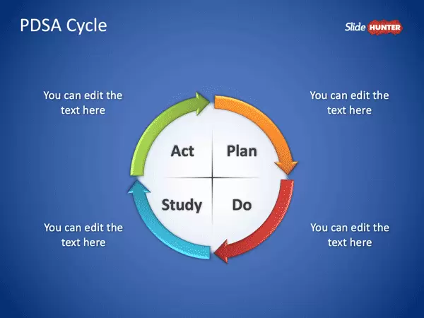 PDSA Cycle PowerPoint Template. The PDSA cycle is a four step model carrying out change. It stands for Plan Do Study Act and it is widely used in Project Management and continuous improvement processes. This variant of the PDSA model is based in the Plan Do Check Out PowerPoint diagram.