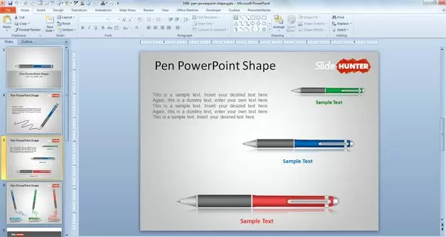 Pen PowerPoint shape comes with four unique slide designs with different color pen designs that you can use in your PPT presentations. For example, you can copy the horizontal pen layout.