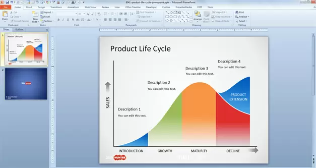 Inside the free PowerPoint template you will find a nice Product Life Cycle curve design created with PowerPoint shapes and editable text boxes to enter your own text.