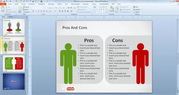 You can use this Pros & Cons presentation layout to prepare a list of Pros and Cons and help visualize this to a large audience. On the left you can enter the pros with a green background.