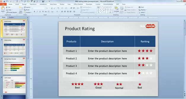 This free PowerPoint template can be used to prepare awesome slides with product comparison and product rating using rating stars shapes. For example, you can list the product features in a table and then assign a rating from 1 to 5 stars using the shapes that you can find in the useful shapes slide.