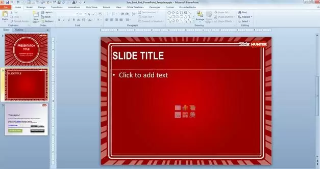 Sun burst PowerPoint Template is a red background for PowerPoint presentations that you can use as an abstract slide design to decorate your presentations with a unique and exclusive design. You can download this free red background template for Microsoft PowerPoint with a sun burst effect and radial lines. Free red burst PowerPoint template can be used to decorate any nature presentation but also other custom presentations like marketing slide designs, business presentations or presentations related to fashion, art, graphics.