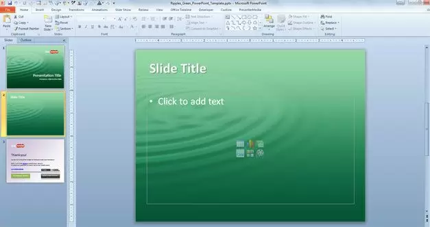 Ripples Green PowerPoint Template is a free PowerPoint template for Microsoft PowerPoint 2007 and 2010 with a green ripples background theme in the master slide.
