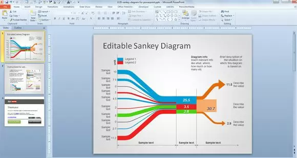 This PowerPoint template comes with instructions about how to change the width of the Sankey diagram.