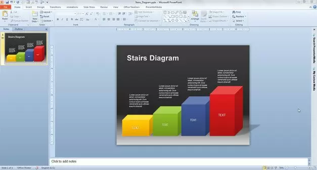 Stairs Diagram for PowerPoint is a free PPT template diagram that you can download as a single .pptx file to make presentations requiring a steps or stair diagram design. This free diagram for PowerPoint has a steps design with colors and you can change the text accordingly to your presentation.
