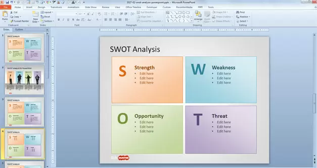 This free SWOT Template for PowerPoint can be used to present a SWOT analysis using Microsoft PowerPoint. The SWOT PPT template contains several layouts and creative SWOT Analysis slide designs that you can use in your Marketing or Business PowerPoint presentations.