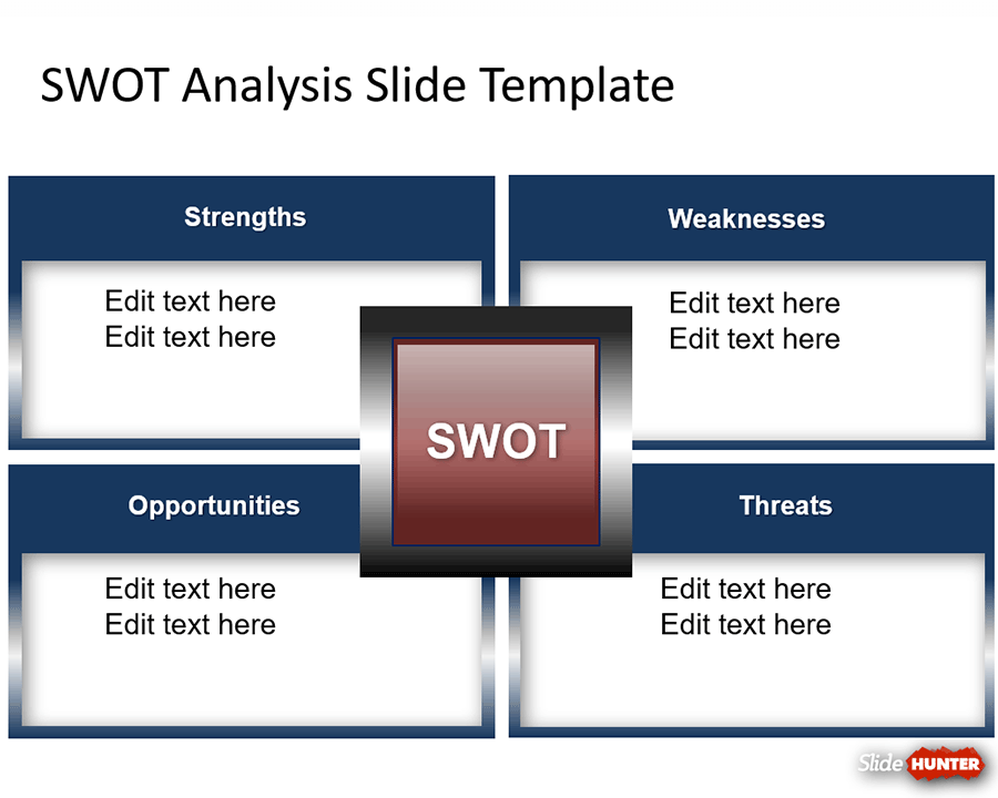 The SWOT Analysis slide template features a simple SWOT diagram with four quadrants that can be easily customized to fit your presentation needs and present your SWOT analysis to an audience. The PPT template consists of a single but powerful SWOT slide with editable placeholders and the word SWOT in the center of the slide.