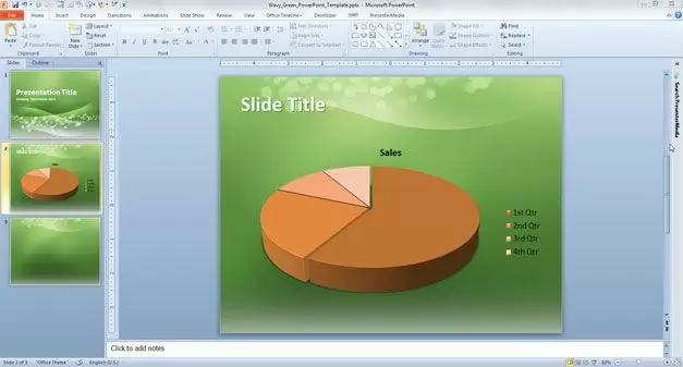 Wavy Green PowerPoint template is a free PowerPoint background design that you can download for presentations in MS PowerPoint 2007 and 2010. This green template for presentations has a blur effect and bubble style in the master slide, but you can also use the internal slide for your presentation content.