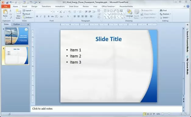 Wind Energy PowerPoint presentation background has a wind image in the background of the master slide and blue color with some nice curves and gradient effects.