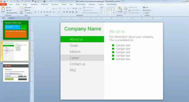 Windows 8 PowerPoint Template is a free PowerPoint template featuring the new Metro interface that you can find in Windows 8 and new Microsoft products like Microsoft Office including PowerPoint, Word, Excel, etc. You can download this free Windows 8 PPT template with a nice Windows 8 Metro interface to make modern PowerPoint presentations on Windows products for example if you are a Windows developer in .NET or C# and want to make software PowerPoint presentations then you can download this free Metro template for PowerPoint.