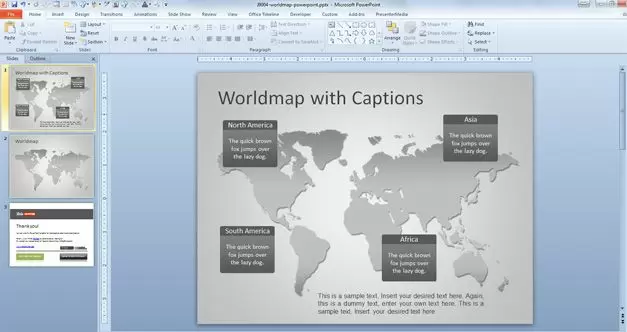 The map template contains two slides and the second slide also have text boxes over the map so you can add captions. For example, if you are creating a business presentation for global corporate, a geography class or global strategy map then you can specify what are your goals and objectives by region.