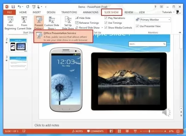 In the first step, open your PowerPoint 2013 Presentation, go to the Slideshow tab and launch the Office Presentation Service (as shown below).
