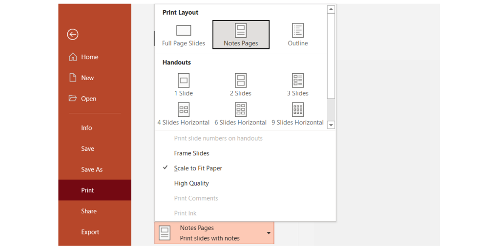 Here, we will be able to choose different printing options. One of these options will allow you to print the speaker notes.