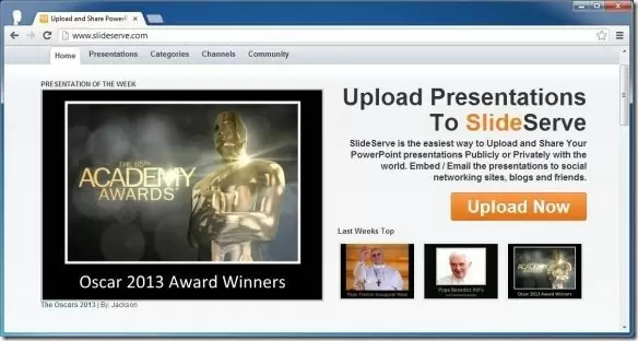This web service provides the utility to quickly upload and share your PowerPoint presentation files, without the need to create an account. You can also browse through various publicly shared presentations according to category and download them to get ideas for your own presentations. To upload your presentation click the Upload Now button from the SlideServe Home Page.