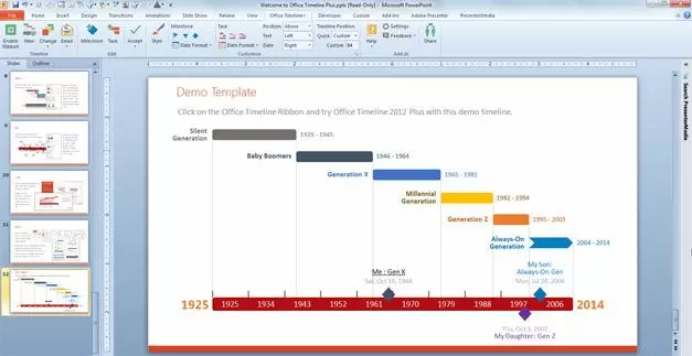As soon as you install the timeline plugin for PowerPoint, you can start creating your timeline using the Office Timeline menu in the PowerPoint ribbon. This menu will make you possible to configure the timeline template to use (choose between ready to use timeline themes or alter the custom colors to match your corporate identity), add milestones and tasks, and configure the look and feel of your timeline, text, labels and colors.