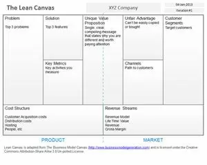 A blank Lean Canvas slide template that you can use to present Lean Canvas in a presentation or poster.