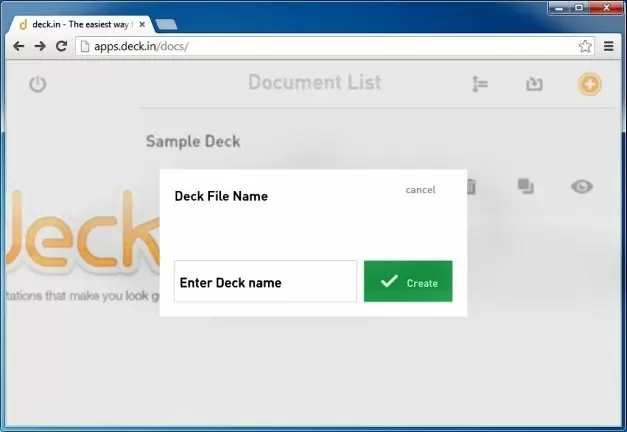To create a presentation, login to your Deck account, hit the โ+โ sign, enter a name for your Deck and click Create.